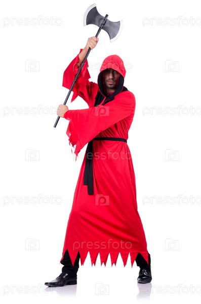 Палач в красной одежде с топором на белом фоне