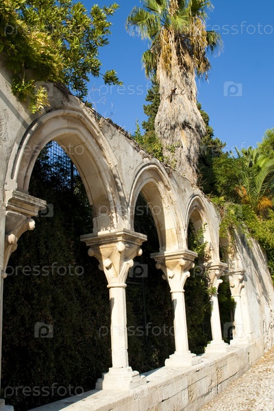 Колонны и арки с пальмы. Церковь в Сиракузах, Италия