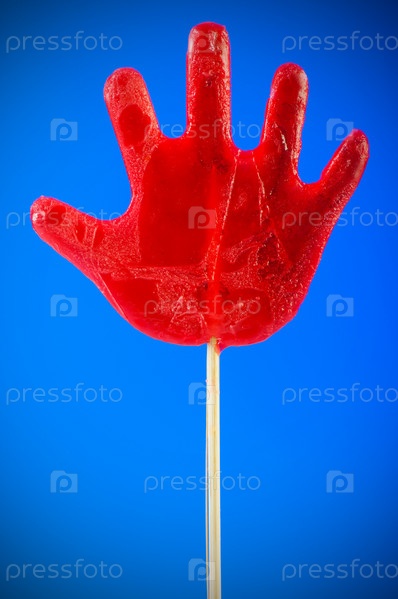 Яркий красный леденец в виде руки на голубом фоне