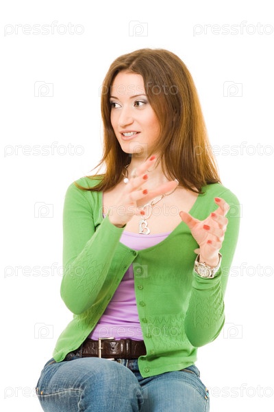 Молодая женщина жестикулирует и смотрит в сторону