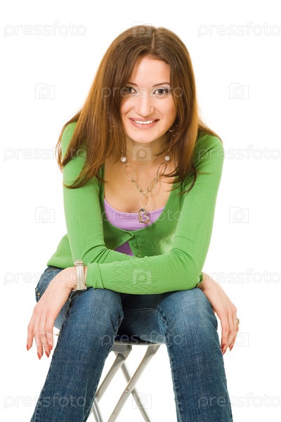 Уверенная молодая женщина в зеленом сидит со скрещенными руками