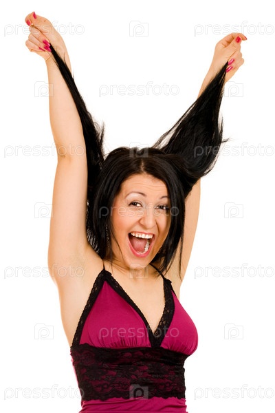 Молодая женщина держит длинные волосы с широко открытым ртом, глядя в камеру