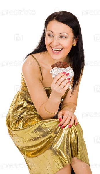 Женщина ест шоколад, улыбается и смотрит в сторону