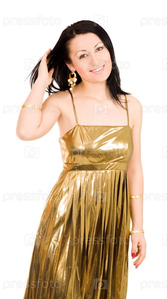 Счастливая женщина стоит в золотом платье и гладит волосы