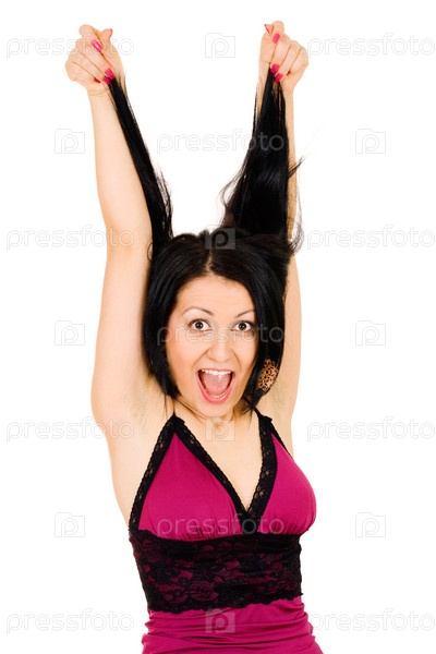 Шокированная женщину в фиолетовом платье с открытым ртом и волосами дыбом смотрит в камеру