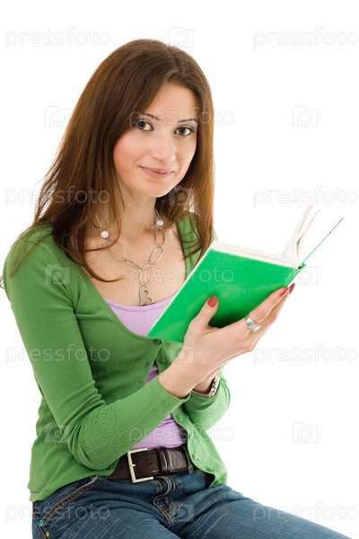 Женщина в зеленом держит зеленую книгу, глядя в камеру