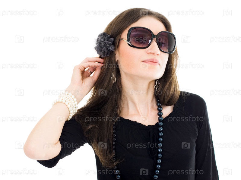 Привлекательная женщина в черном платье и солнцезащитных очках прислушивается