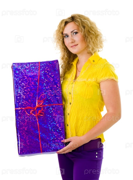 Женщина в желтой рубашке стоит с большим подарком