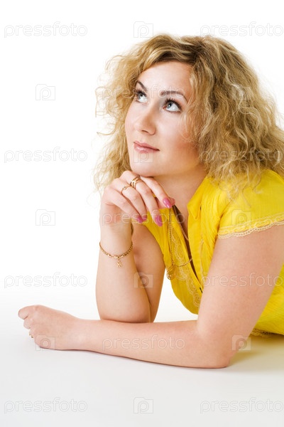 Спокойная женщина, лежащая на полу в желтой одежде