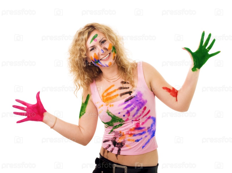 Блондинка с отпечатками краски на лице и одежды