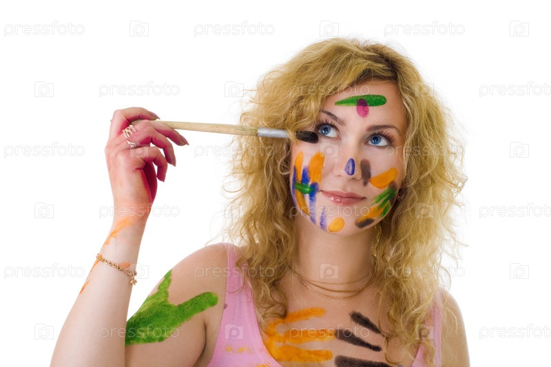 Блондинка с отпечатками краски на лице и одежды