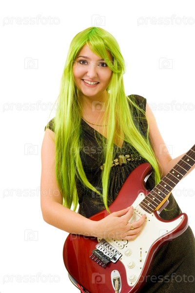 Молодая женщина с длинными цветными волосами играет на красной гитаре