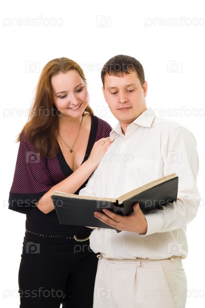 Молодая пара стоит и смотрит в книгу или альбом