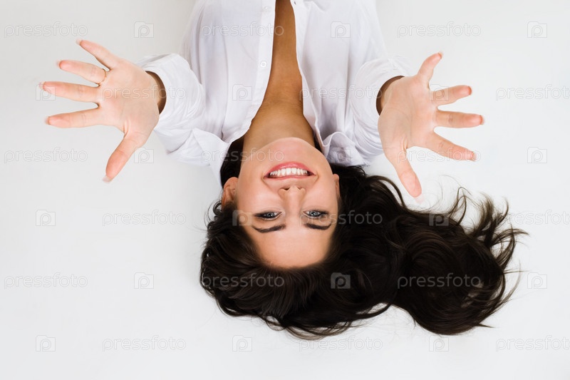 Молодая женщина, протягивающая руки на белом фоне