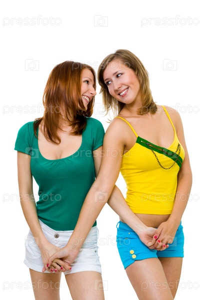 Две подруги держатся за руки и смотрят в камеру