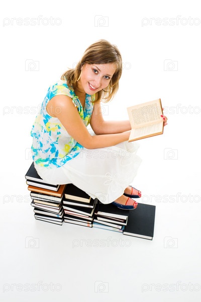 Девушка читает книгу, сидя на стопке из книг