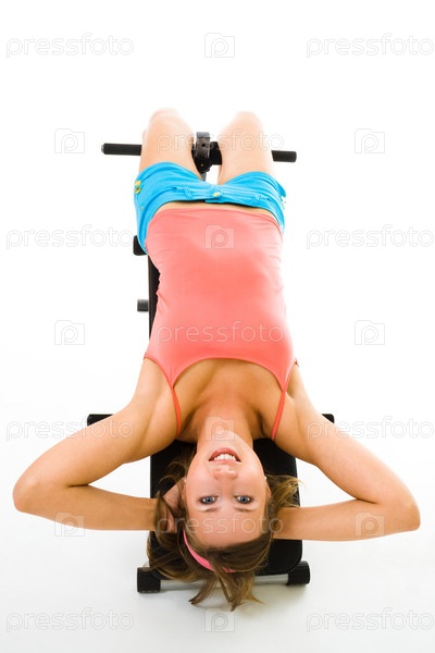 Женщинакачает брюшной пресс на скамейке в тренажерном зале