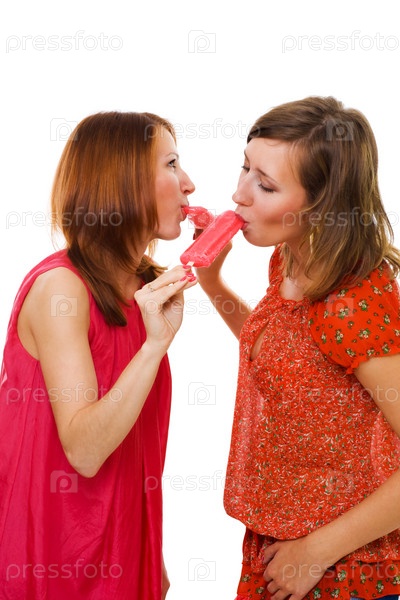Две молодые красивые женщины кормят друг друга мороженым