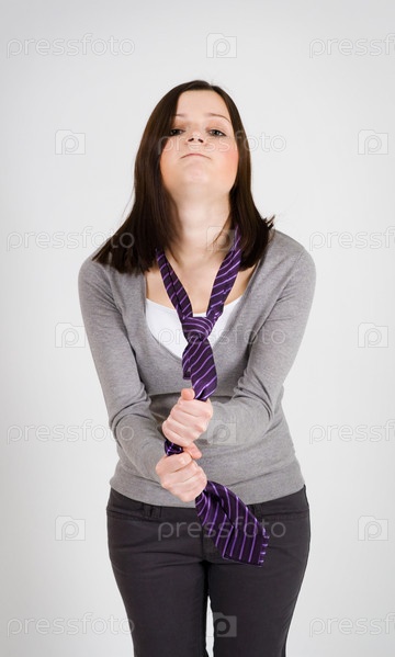 Молодая женщина, сжимающая галстук в руках