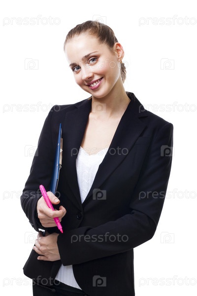 Портрет деловой женщины с планшетом и ручкой в руках