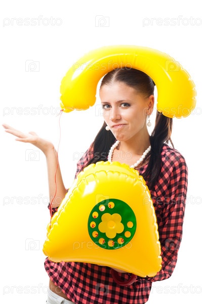 Счастливая молодая девушка с надувным детским телефоном