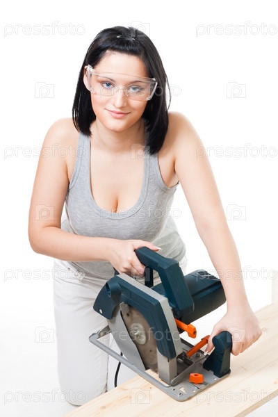 Женщина, работающая с электропилой