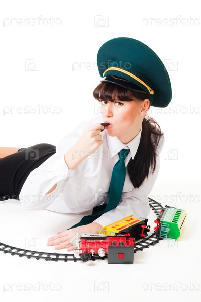 Девушка играет с детской железной дорогой