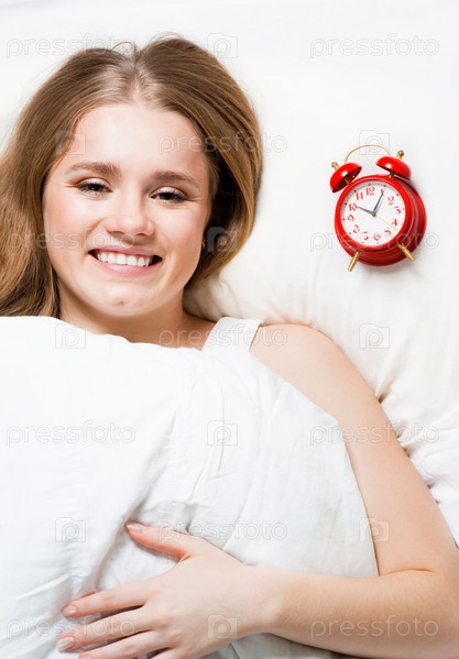 Женщина в постели с будильником на подушке