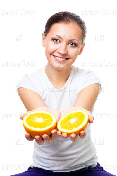 Улыбающаяся молодая женщина предлагает апельсин