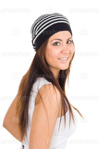 Молодая женщина с длинными волосами в белой майке и черно-белой шапке