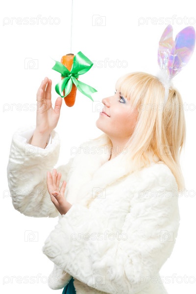 Женщина в костюме кролика тянется за морковкой