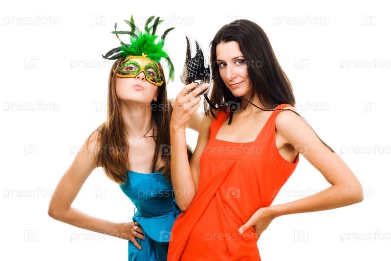 Две девушки в маскарадных масках и ярких платьях флиртуют, изолированные на белом фоне