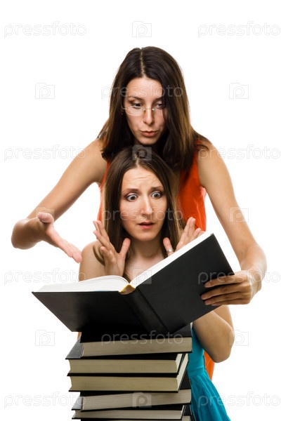 Две шокированные женщины смотрят в книгу, изолированные на белом фоне
