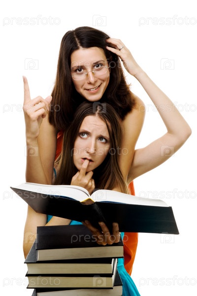 Две женщины с множеством книг исследуют новую тему, изолированные на белом фоне