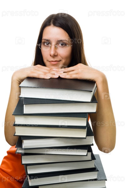 Молодая умная студентка с кучей книг, изолированная на белом фоне