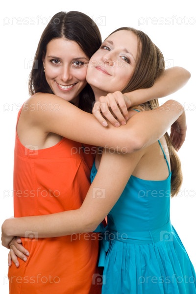 Две счастливые молодые женщины стоят, обнявшись, изолированные на белом фоне