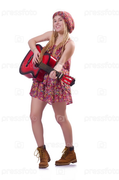Женщина с гитарой, изолированная на белом