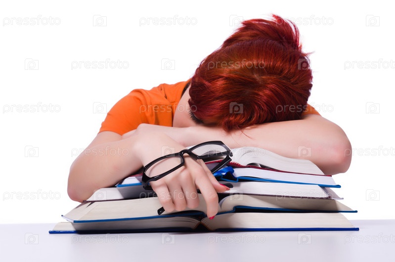 Молодая студентка, уснувшая на книгах