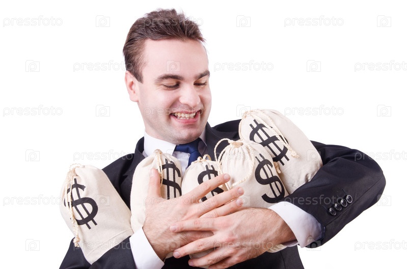 Бизнесмен с мешками денег на белом