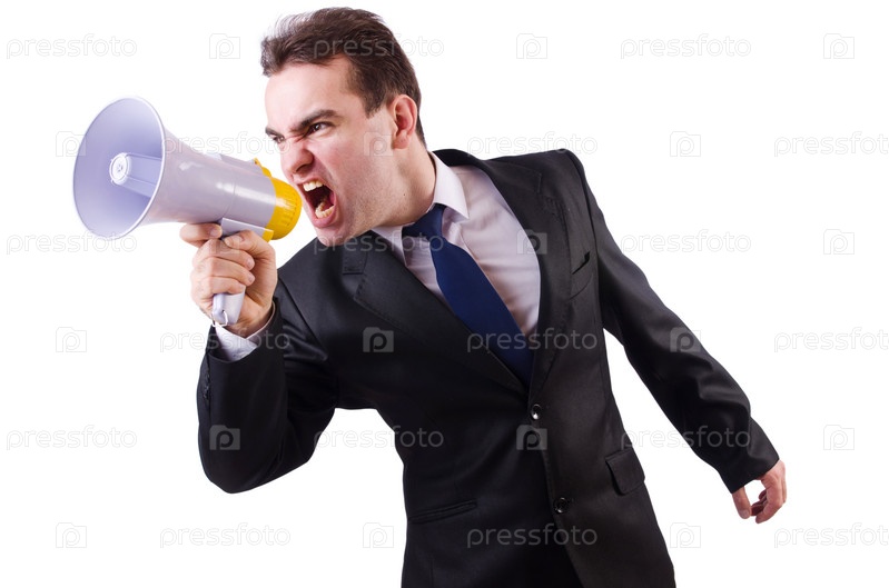 Молодой предприниматель с громкоговорителем на белом фоне