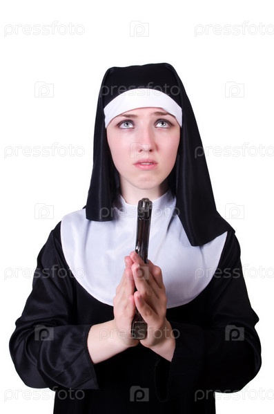 Монахиня с пистолетом, изолированная на белом