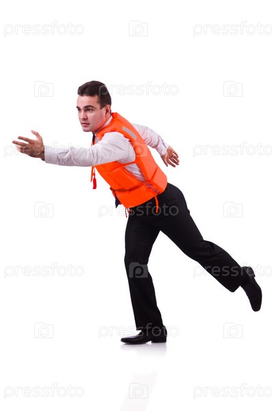 Бизнесмен в спасательном жилете на белом фоне
