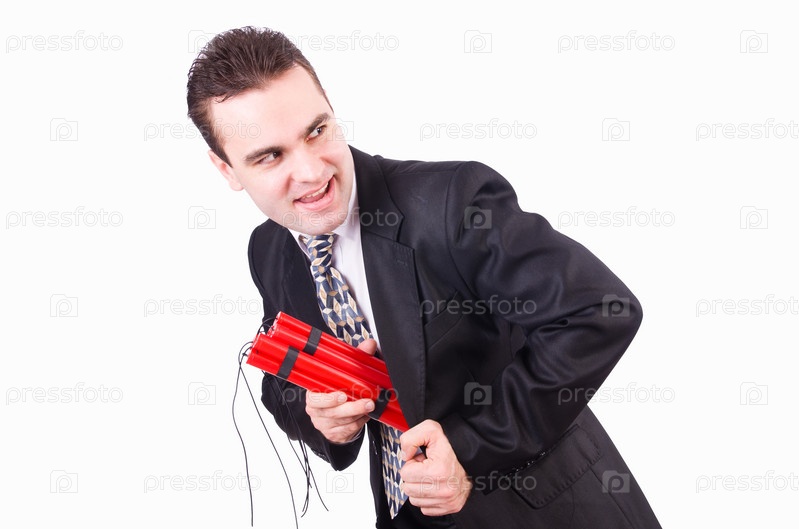 Бизнесмен с динамитом, изолированный на белом