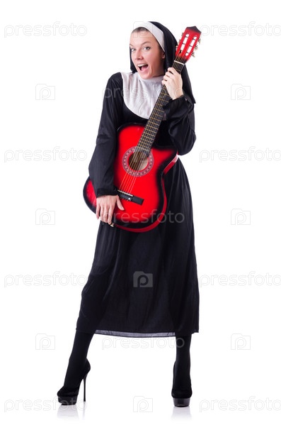 Монахиня играет на гитаре, изолированная на белом фоне