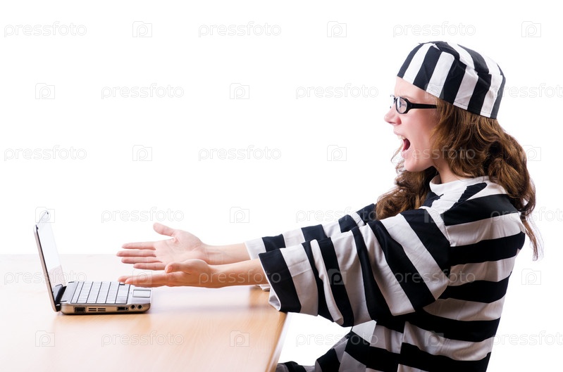 Преступный хакер с ноутбуком на белом фоне