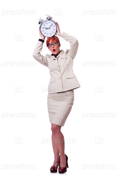Деловая женщина с часами на белом фоне
