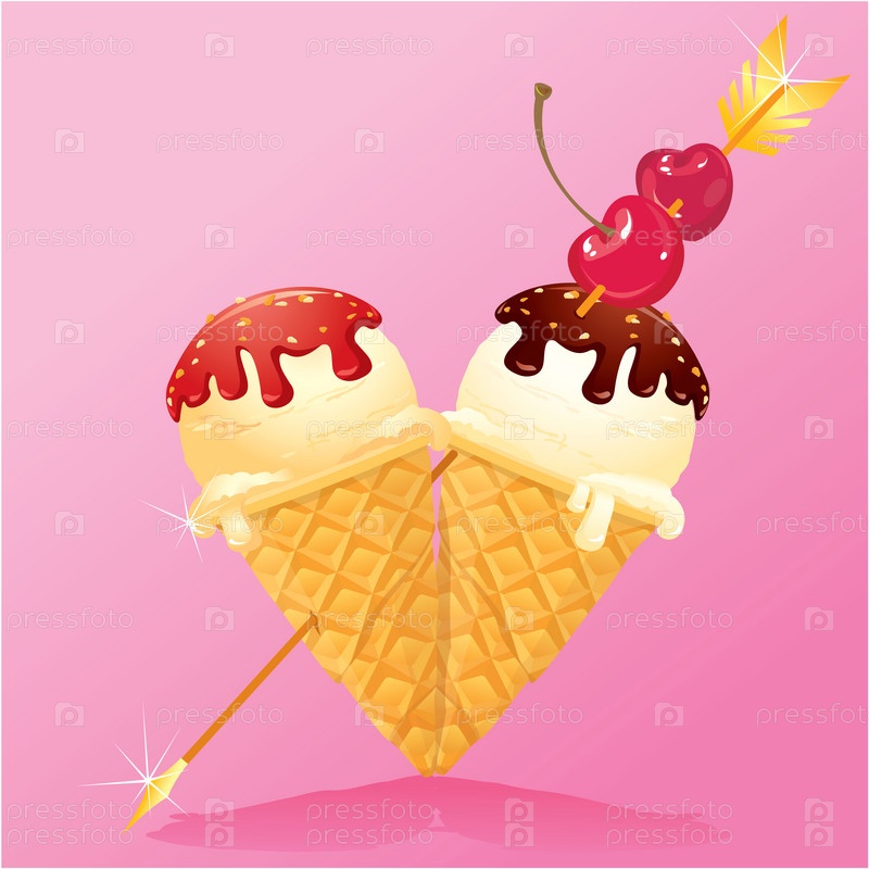 Ванильное мороженое с глазурью и клубникой в форме сердца и вишней. Дизайн для дня Святого Валентина