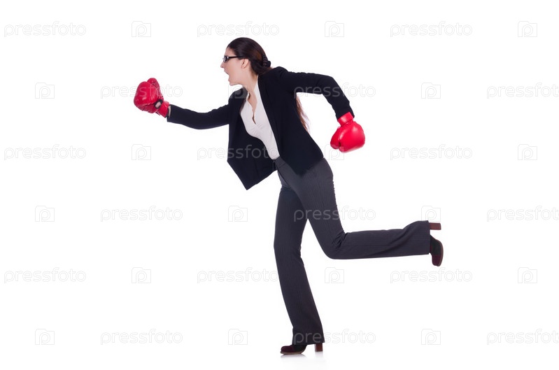 Бизнес-леди в боксерских перчатках на белом