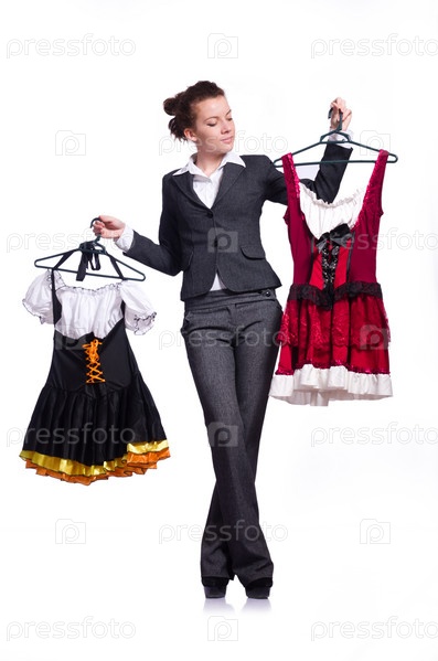 Женщина пытается выбрать платье на белом