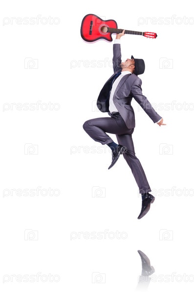 Бизнесмен с гитарой, изолированный на белом